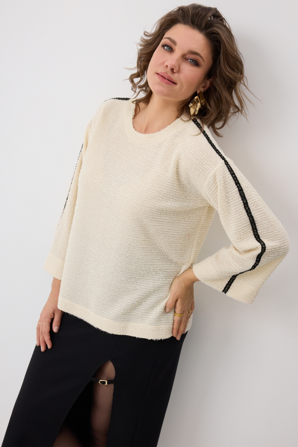 тесьма контрастного цвета с вплетением люрекса. Низ рукава и низ изделия обработаны