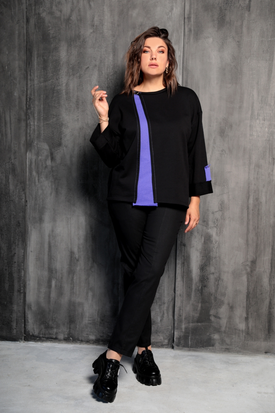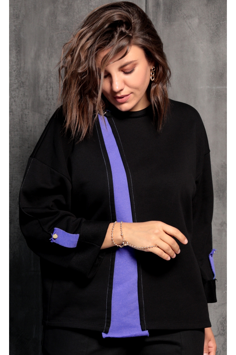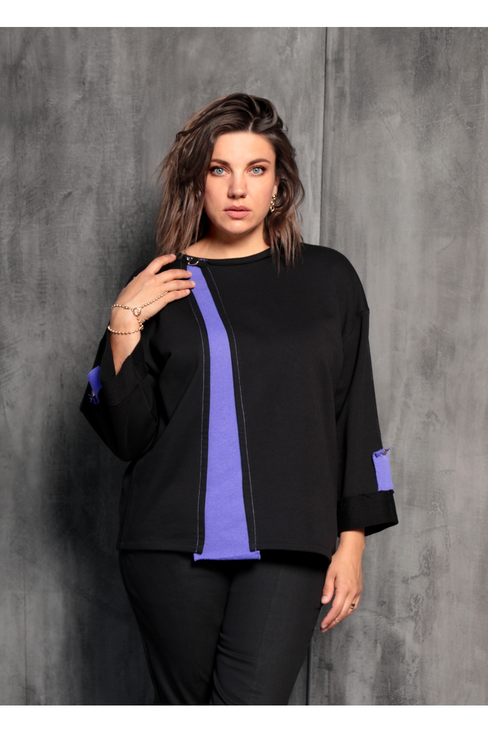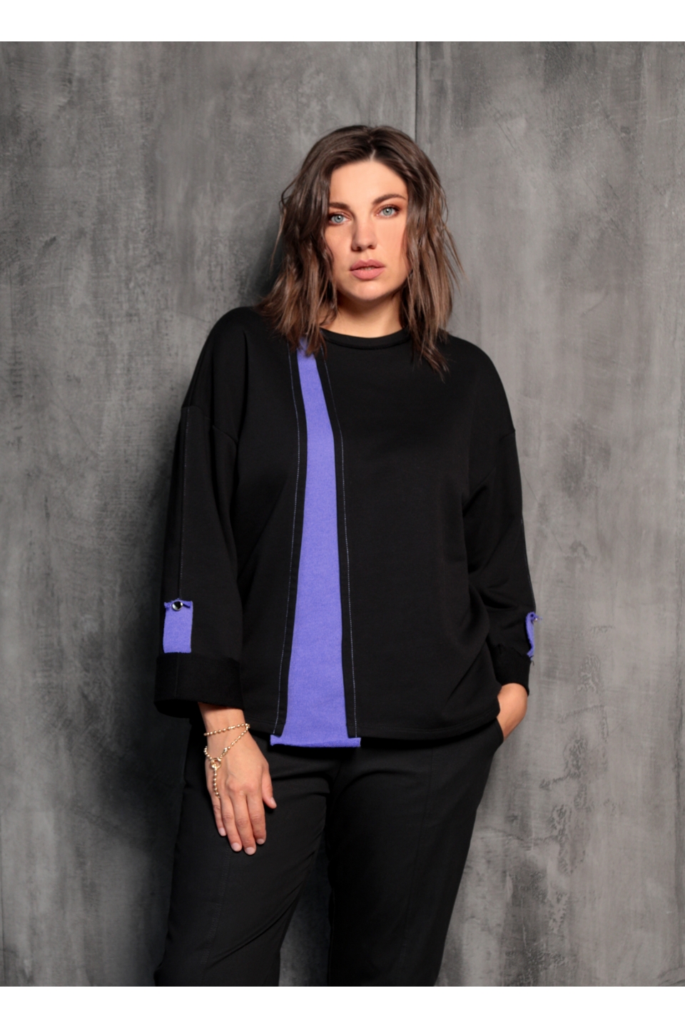 Стильный, удобный, практичный свитшот. Выполнен из мягкой трикотажной ткани трёхнитки, в составе которой 65% хлопка. Горловина декорирована золотистой пряжкой. Отличительной чертой этого свитшота является слегка спущенная линия плеча и расклешённый рукав. Длина 5/8, подогнут изнаночной стороной наружу и декорирован патой с золотой пуговицей. Цветная вставка вытягивает силуэт и создаёт выгодный акцент на Вашей фигуре.