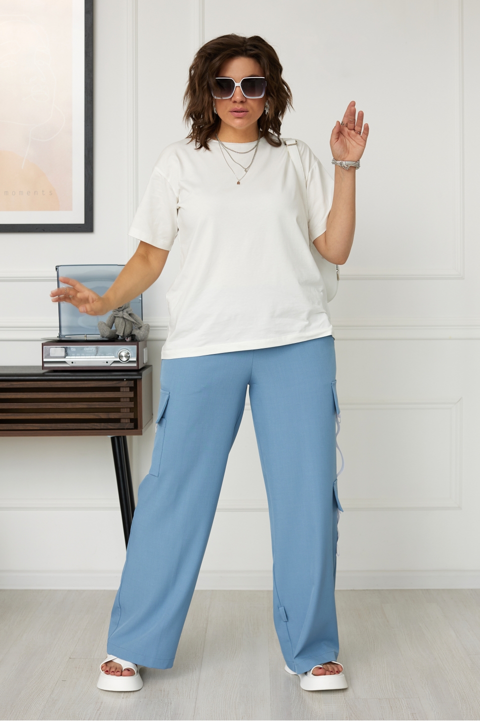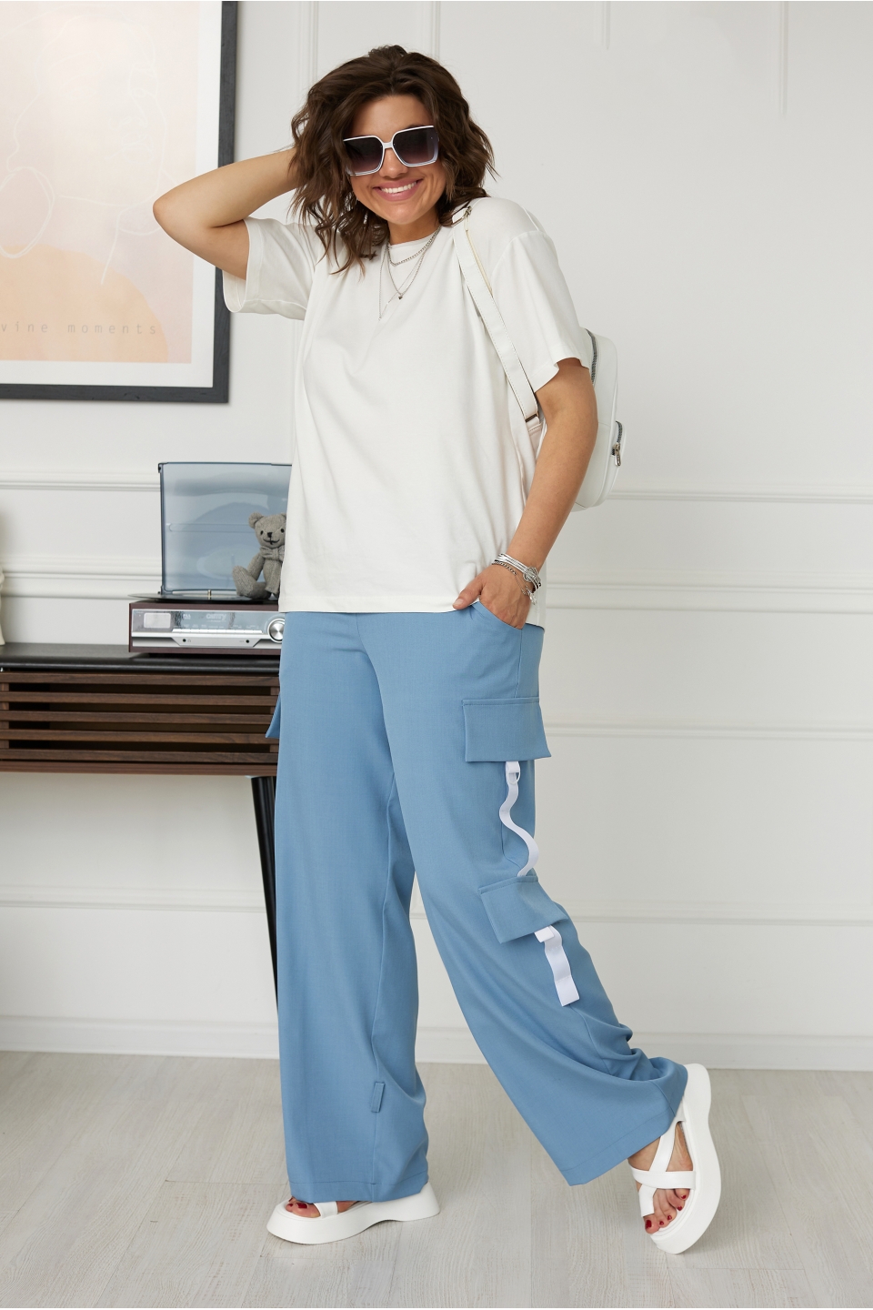 Вашему вниманию представляем настоящий тренд этого сезона! Брючки «Карго» широкого кроя. Очень стильная и комфортная модель. Выполнены из приятной, растяжимой ткани, которая хорошо держит форму.На боковом шве левой брючины настрочена декоративная лента и притачные клапаны с металлическим полукольцом. На боковом шве правой брючины накладной карман с клапаном и металлическим полукольцом.