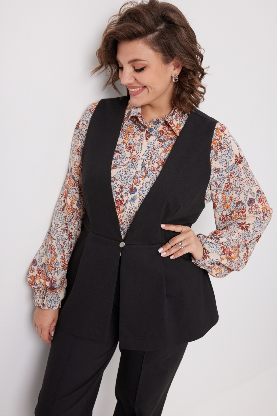 талии создают односторонние складки по линии переда. Жилет отлично сочетается