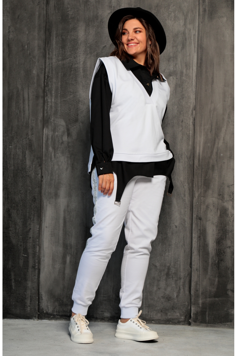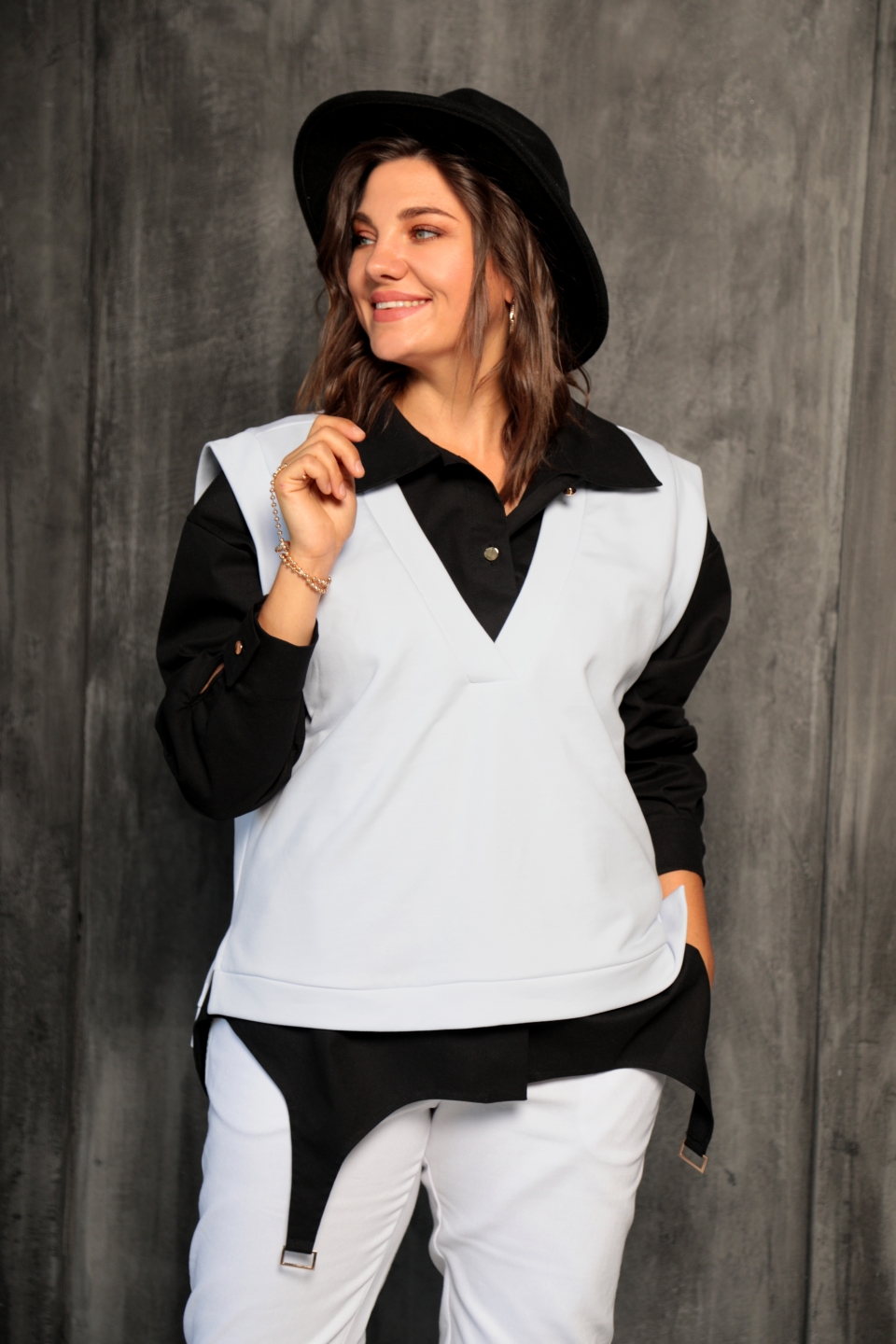 Трикотажный жилет без рукавов - это стильный элемент женской одежды, который позволяет создавать многослойные образы в любое время года. Выполнен из хлопкового трикотажа средней плотности. Задняя часть удлиненная, в боковых швах разрезики, которые не только дополняют интересный крой жилета, а так же созданы для вашего комфорта при носке и движении. V-образный вырез горловины обработан широкой обтачкой и визуально удлиняет шею и лицо. Жилет можно сочетать как с классической блузой, так и с футболкой.