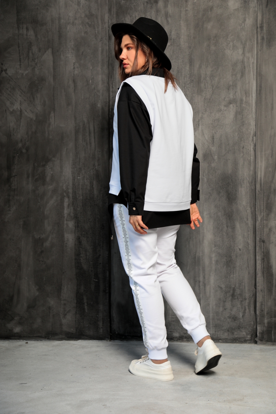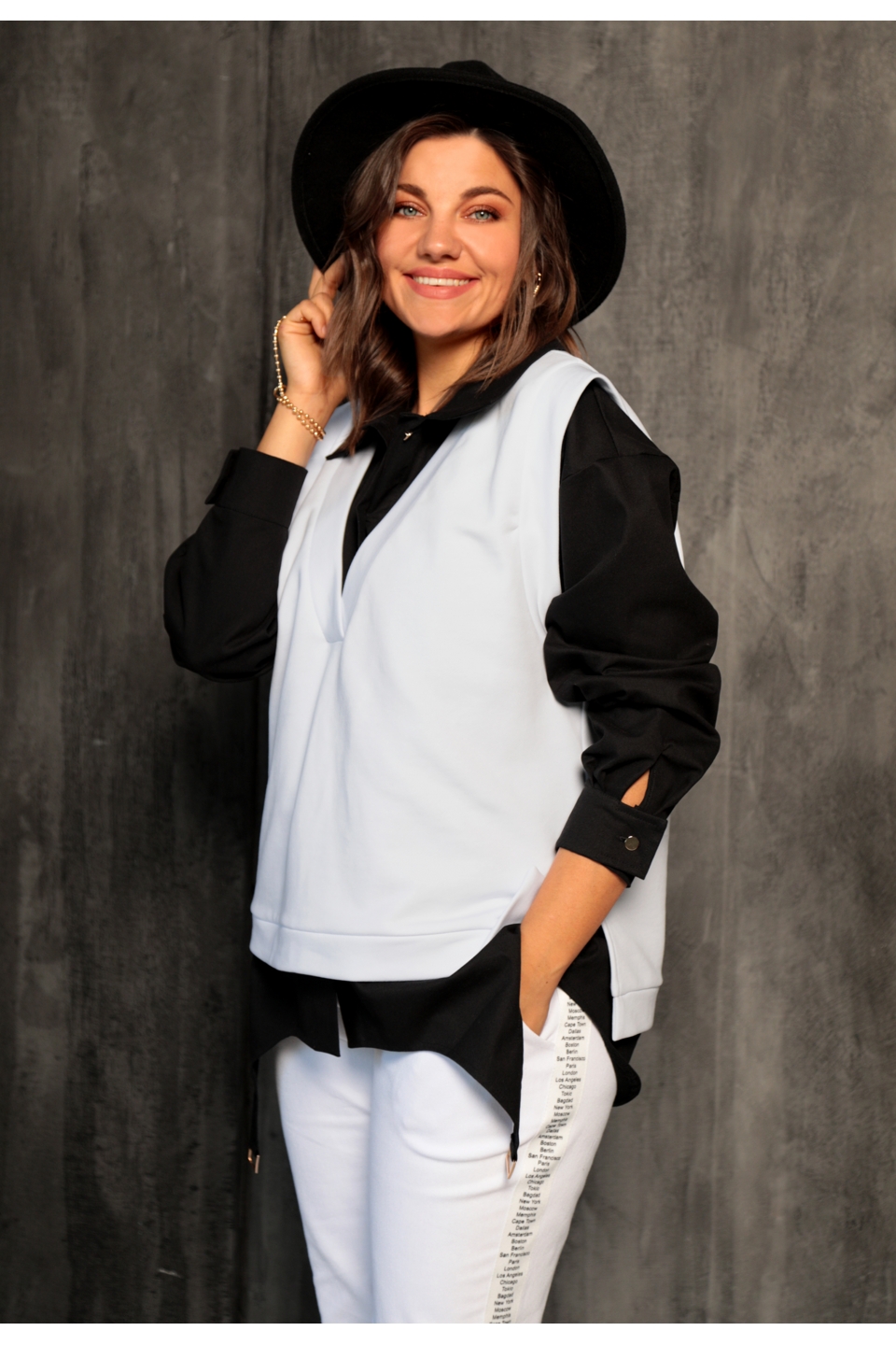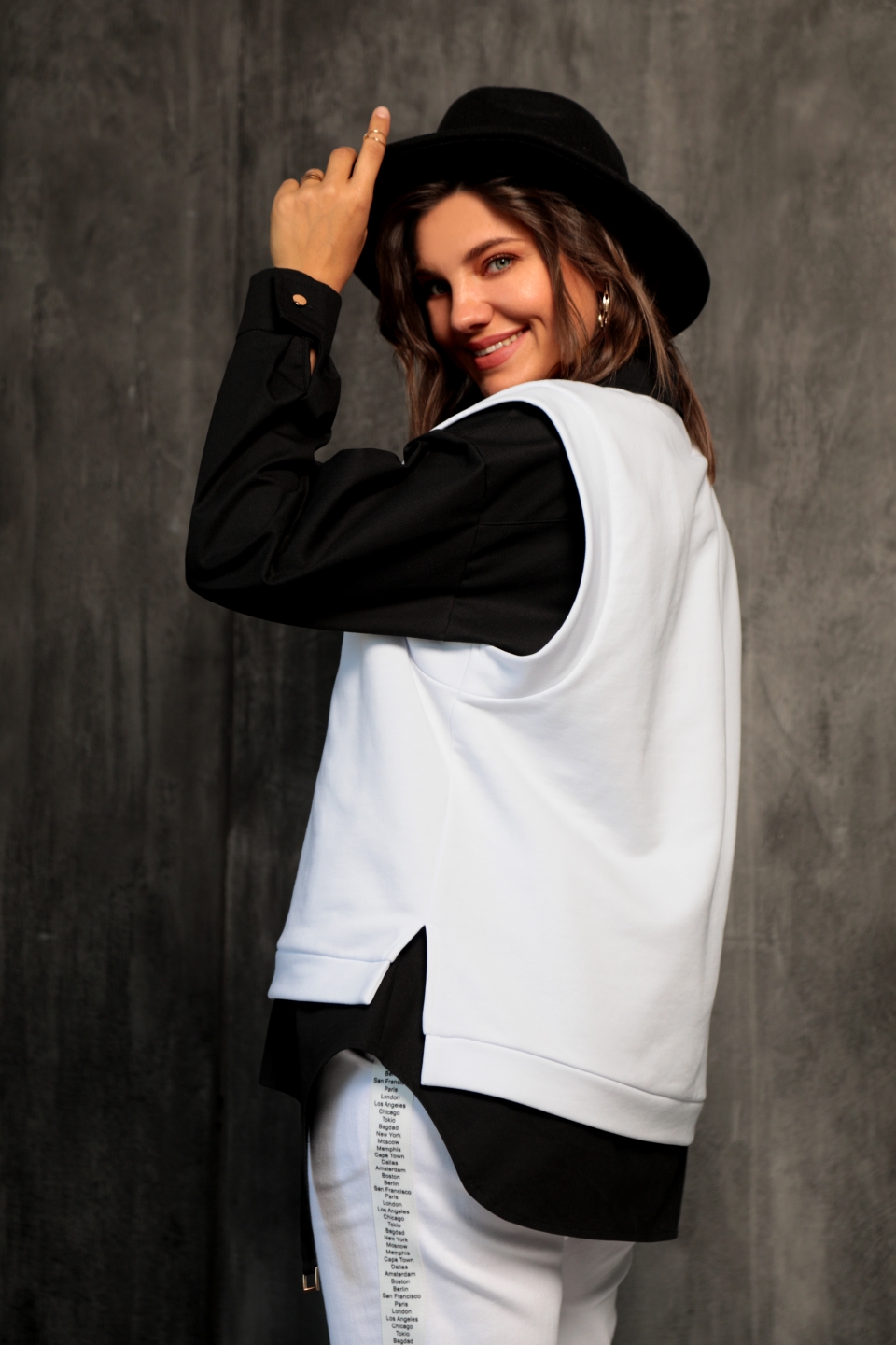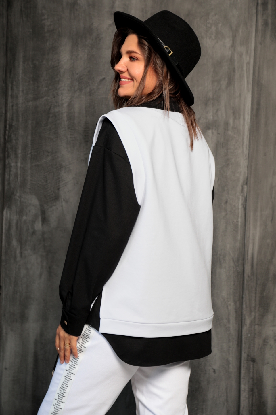 Пройма увеличенная, обработана притачной обтачкой, что позволяет сочетать жилет с любыми формами рукава, нижнего слоя образа.