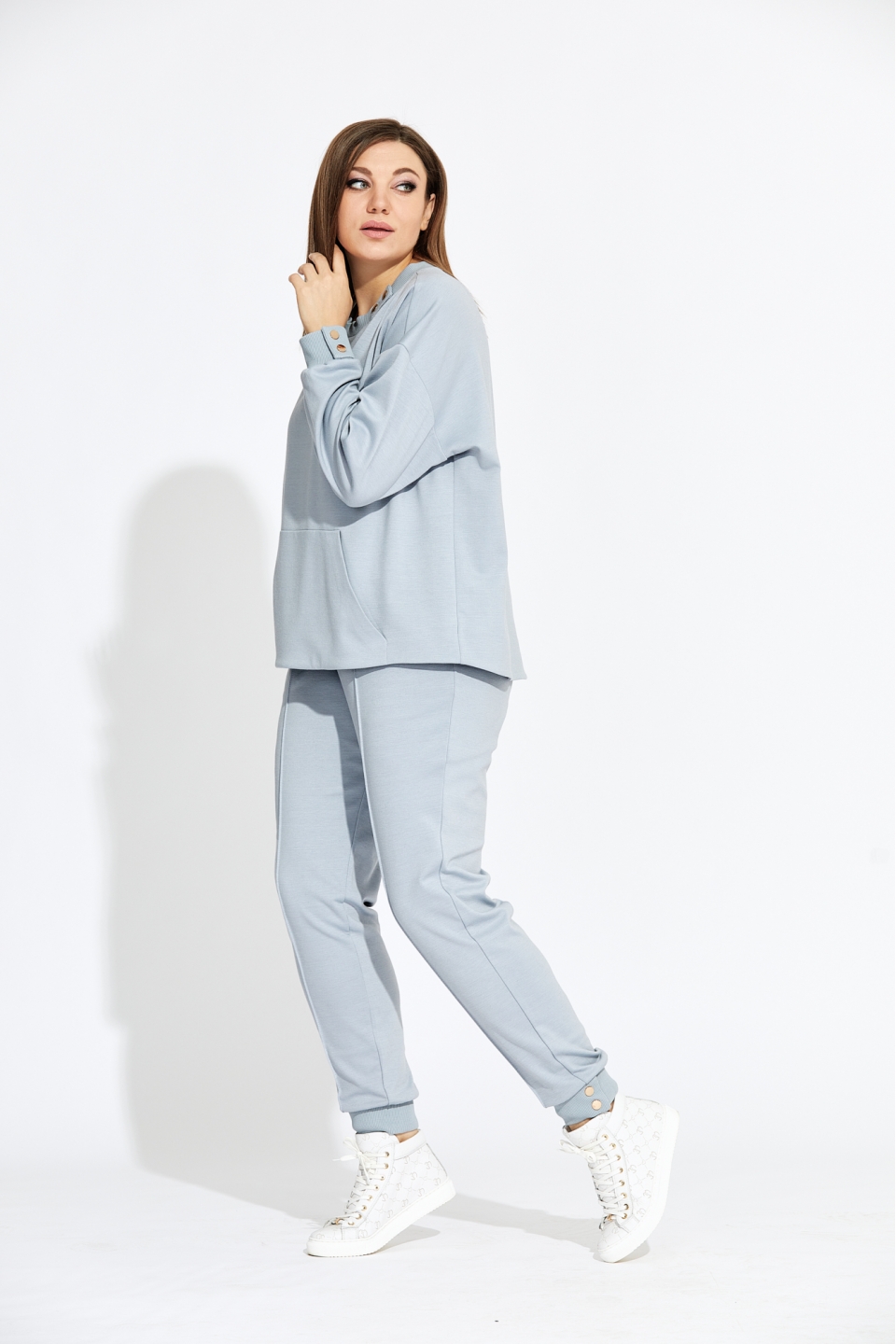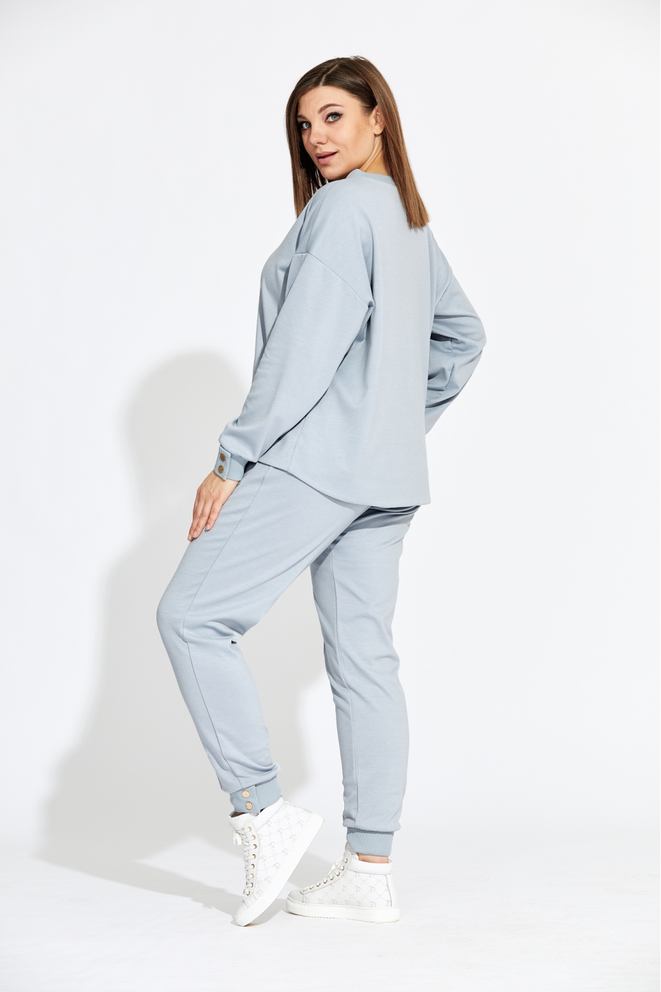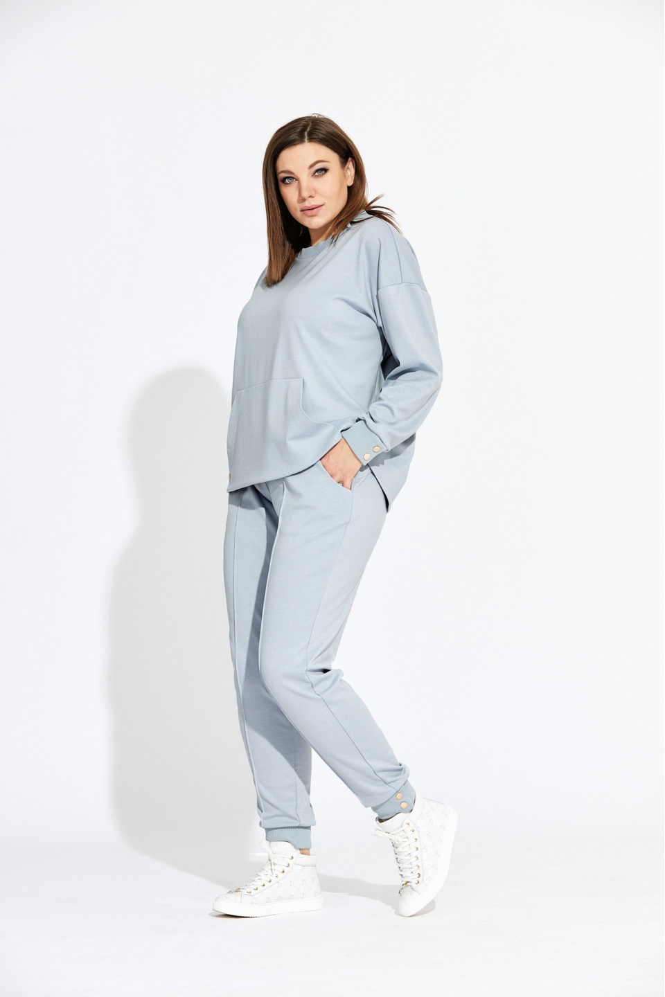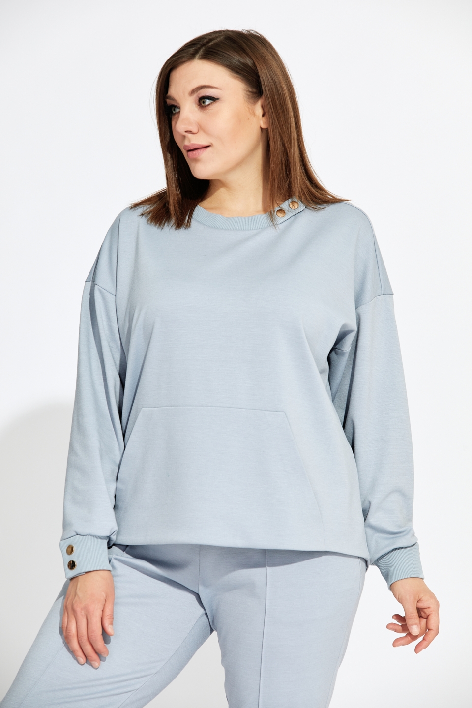 Комплект женский прямого силуэта, состоящий из свитшота и брюк. Стильный и в то же время минималистичный дизайн. Выполнен из мягчайшего трикотажа. Фурнитура создаёт определённую индивидуальность с намёком на роскошь. Оригинальный свитшот с накладным карманом спереди, прекрасно подчёркивает все достоинства фигуры. Спинка изделия длиннее полочки и имеет форму полукруга по низу. Рукав втачной со спущенной проймой и притачной манжетой. Все манжеты имеют функцию расстёгивания кнопок и выполнены из кашкорсе. Элегантная стрелочка на брюках позволяет визуально удлинить ногу и придаёт определённую индивидуальность вашему образу. В боковых швах имеются карманы «Хулиганы». Пояс притачной на резинке. Низ брюк обработан манжетой из кашкорсе, на которой расположены две пробивные кнопки имеющие функцию расстёгивания. Измерения изделия в готовом виде: Длина по центру спинки: 66 см Длина рукава от горловины: 72 см Обхват груди: 120 см/48р; 124 см/50р; 128 см/52р; 132 см/54р; 136 см/56р; 140 см/58р; 144 см/60р; 148 см/62р. Длина брюк: 104 см Обхват бёдер: 106 см/48р; 110 см/50р; 114 см/52р; 118 см/54р; 122 см/56р; 126 см/58р; 130 см/60р; 134 см/62р. Обхват пояса в сжатом виде: 78 см/48р; 82 см/50р; 86 см/52р; 90 см/54р; 94 см/56р; 100 см/58р; 102 см/60р; 104 см/62р. Обхват пояса в растянутом виде: 128 см/48р; 132 см/50р; 136 см/52р; 140 см/54р; 144 см/56р; 150 см/58р; 152 см/60р; 154 см/62р. Рост фотомодели 174 см, размер одежды на фото 52.