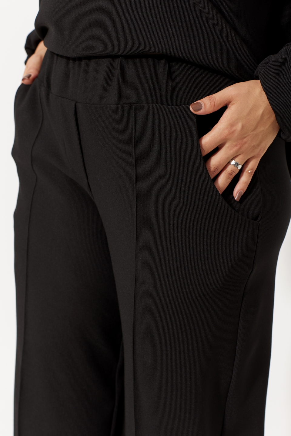 Брюки палаццо с высокой посадкой с застроченными стрелками визуально удлиняют ножки. В боковых швах карманы хулиганы. Пояс широкий на резинке.