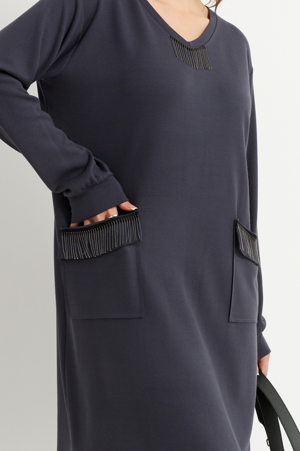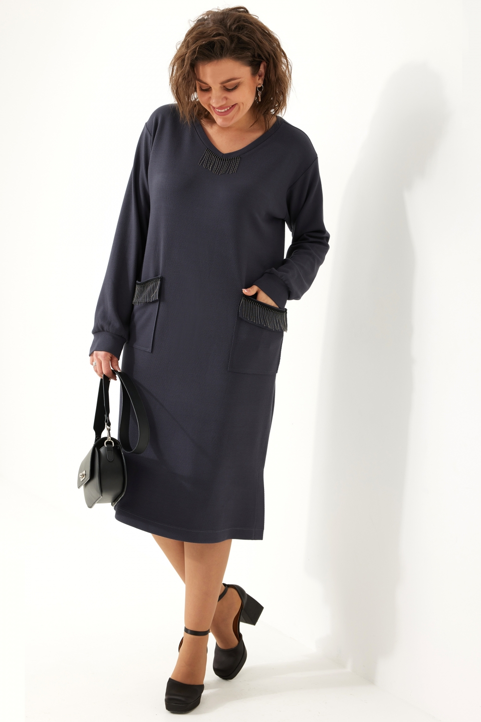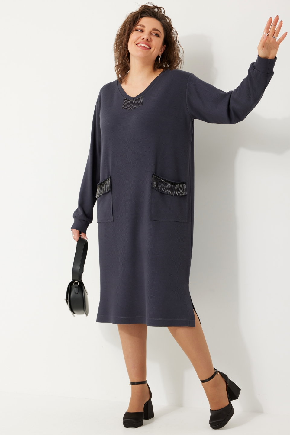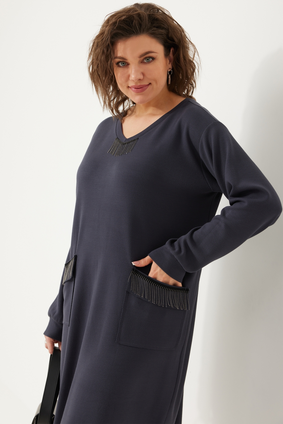 Рукав со спущенной проймой, на манжете из основного материала. Горловина имеет V - образный вырез и декорирована металлической тесьмой в виде бахромы. В боковых швах платья разрезы, что добавляет удобство при движении.