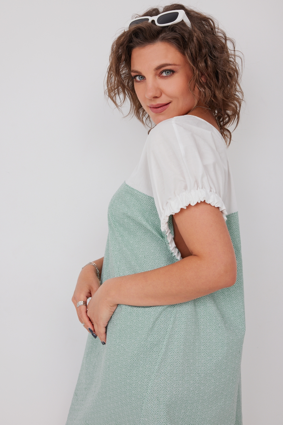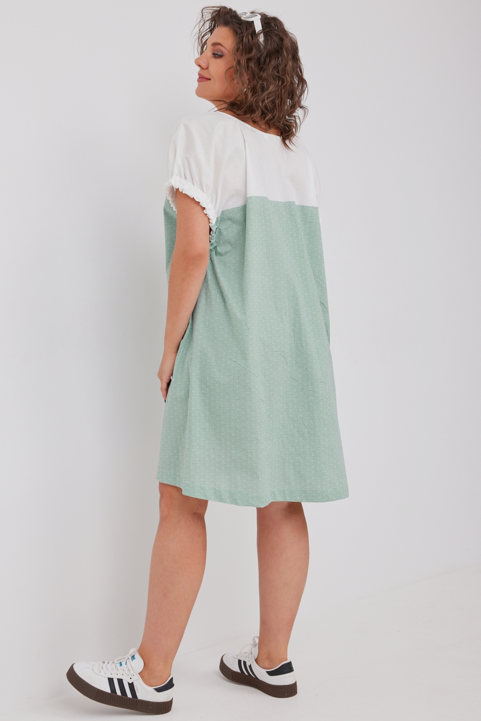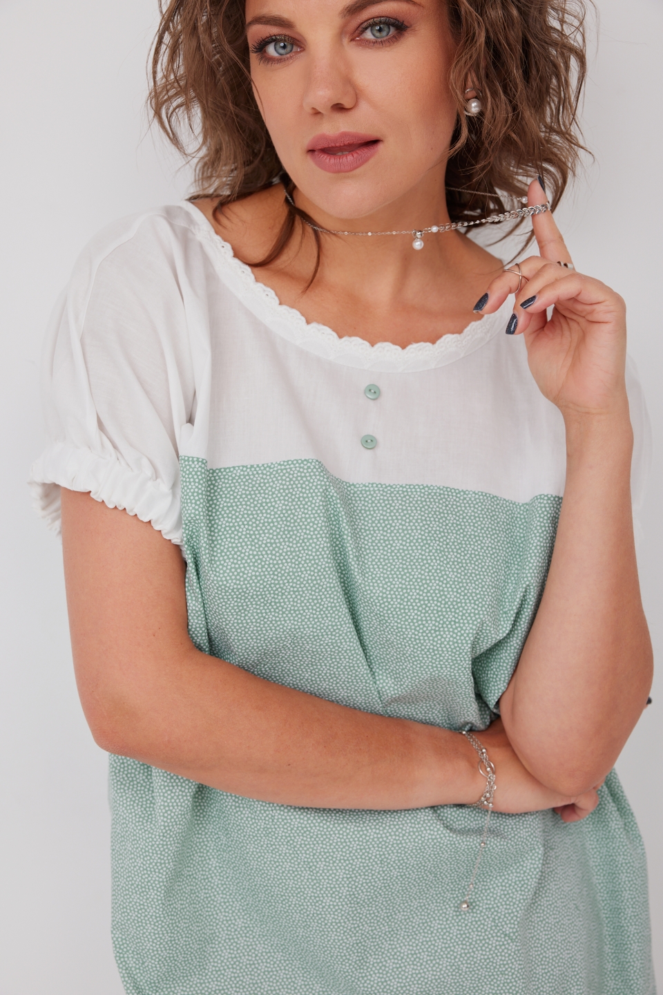 молочного и мятного оттенков прекрасно освежает образ. Горловина имеет округлый