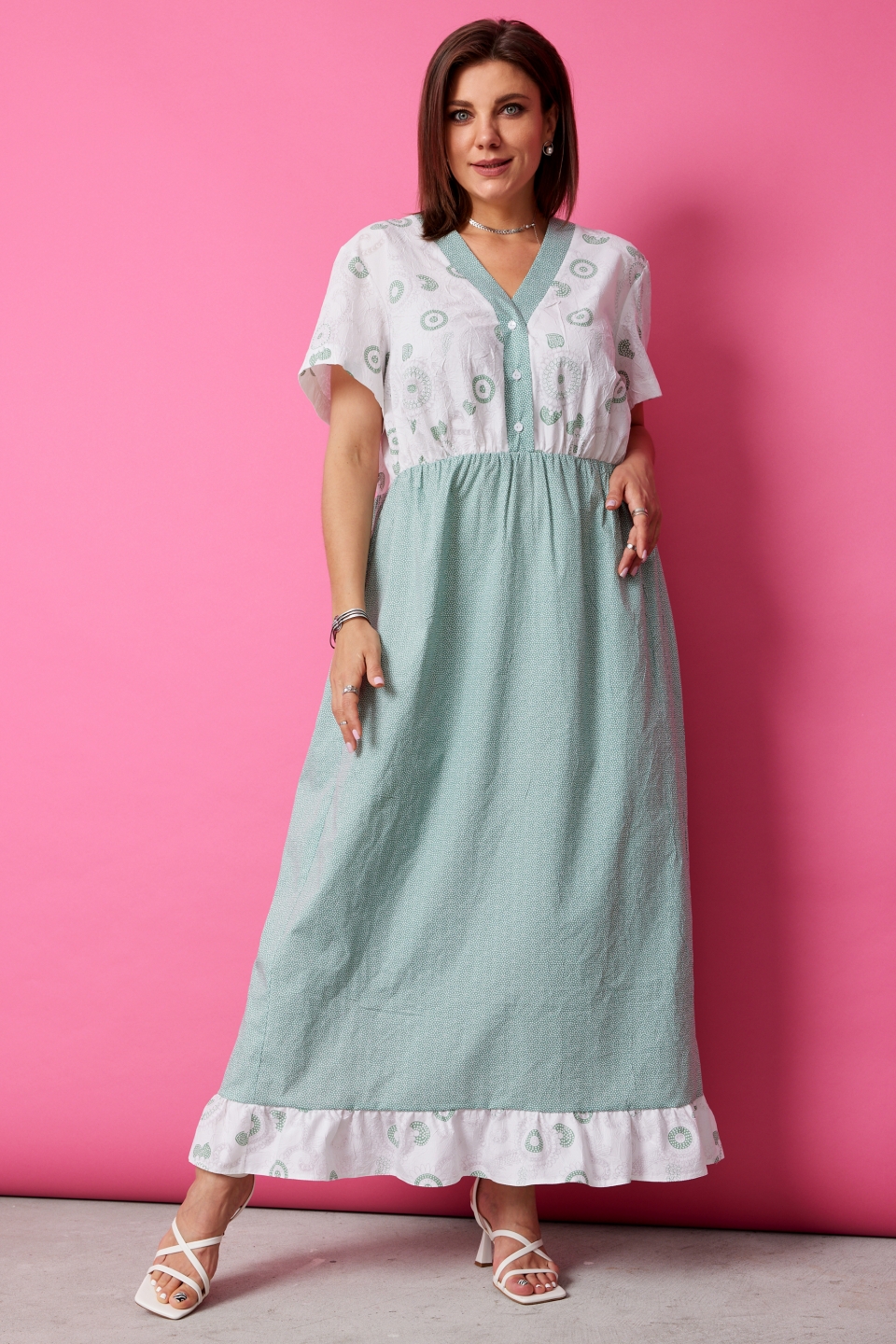 декольте. Короткие втачные рукава придают образу игривость и свободу. Платье