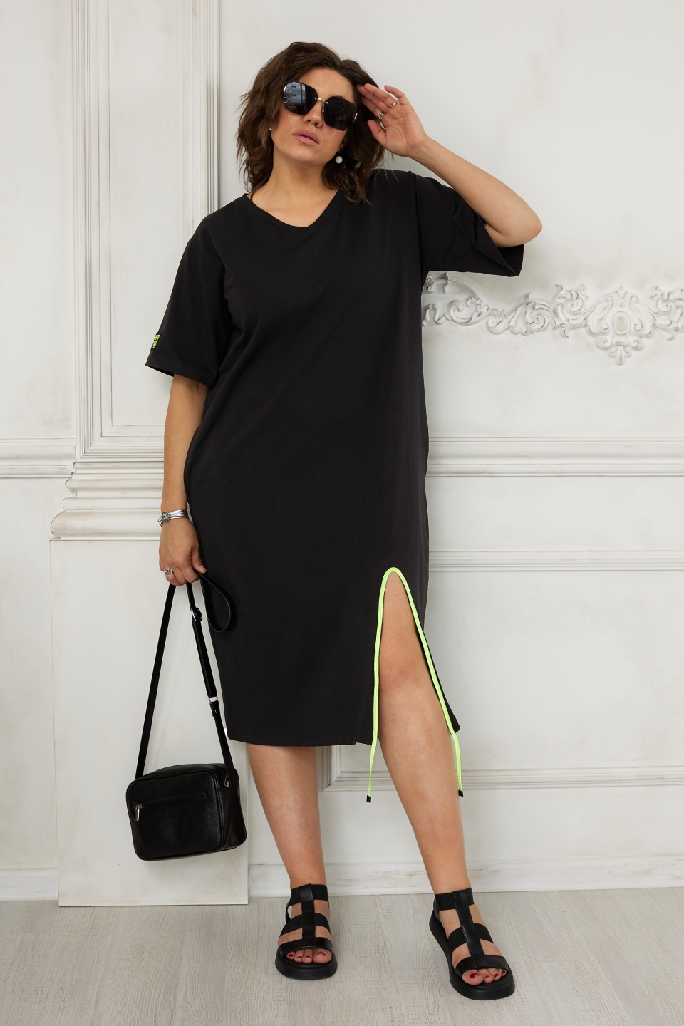 Рукава имеют слегка расклешённую форму один из которых украшен яркой нашивкой. V-образный вырез горловины выгодно удлиняет линию шеи. В боковых швах