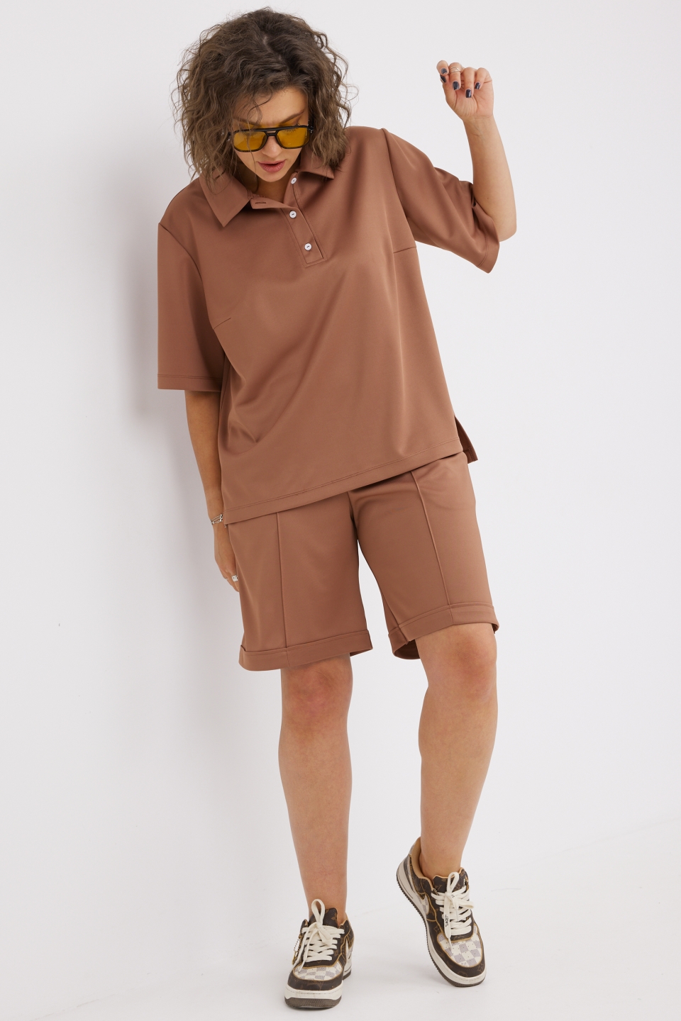 Шорты свободного прилегания, дополнены карманами «Хулиганами». По передней и задней части застрочены стрелки. Верх шорт обработан широким поясом с островком с эластичной резинкой. Нижний край шорт обработан подгибкой с закрытым швом по лицевой части изделия.