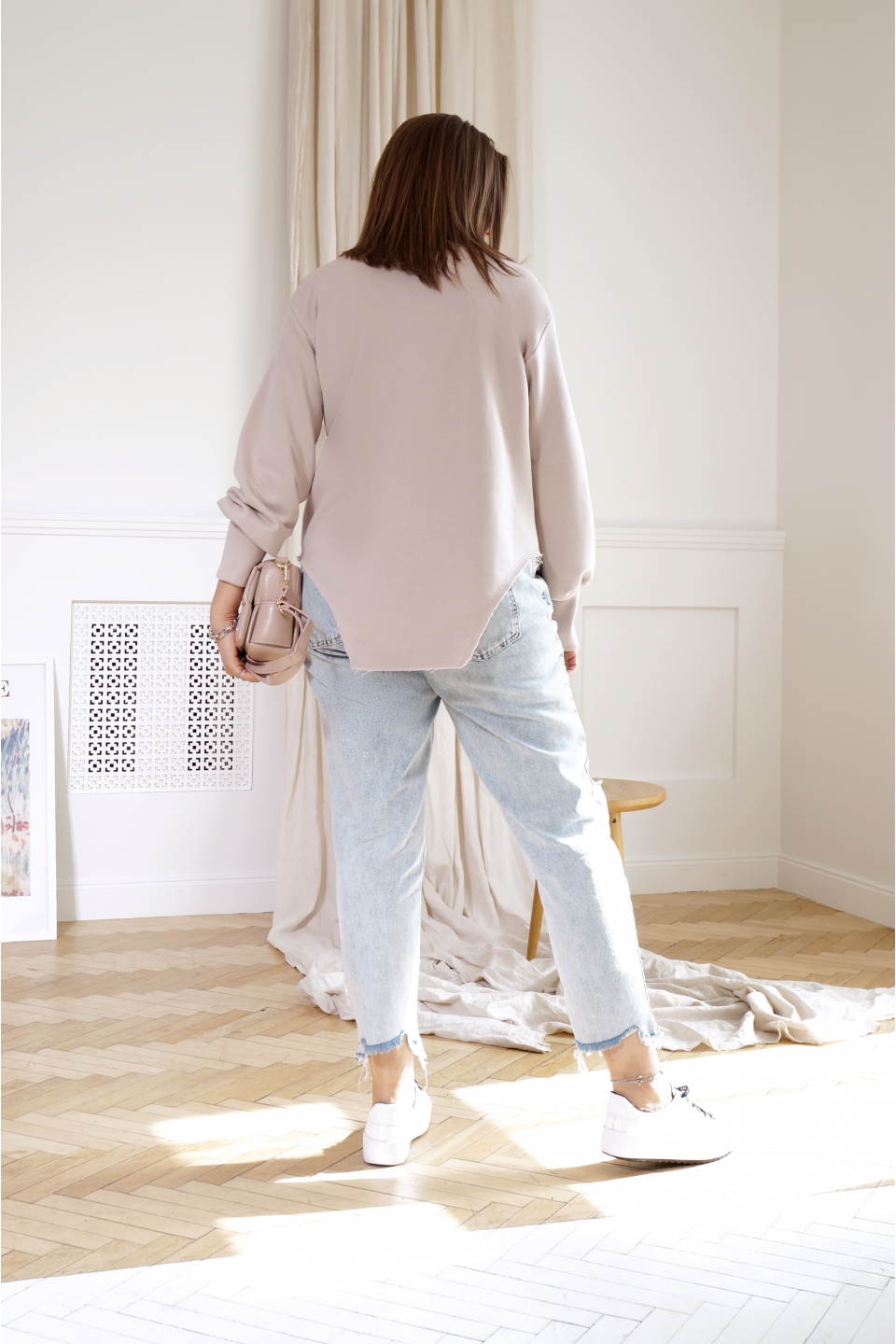 Свитшот свободного кроя, выполнен из хлопкового трикотажа. Модель, притягивающая к себе внимание окружающих. После первой же примерки, вы не захотите с ним расставаться. Рукав втачной со слегка спущенной проймой и расклешённый к низу, обработан широкой манжетой из кашкорсе, что придаёт низу рукава форму «фонарика». Низ изделия обработан декоративной плоскошовной строчкой и имеет необычную форму кроя, напоминающую боди. Это позволяет визуально удлинить ноги и придаёт особую индивидуальность вашему образу.