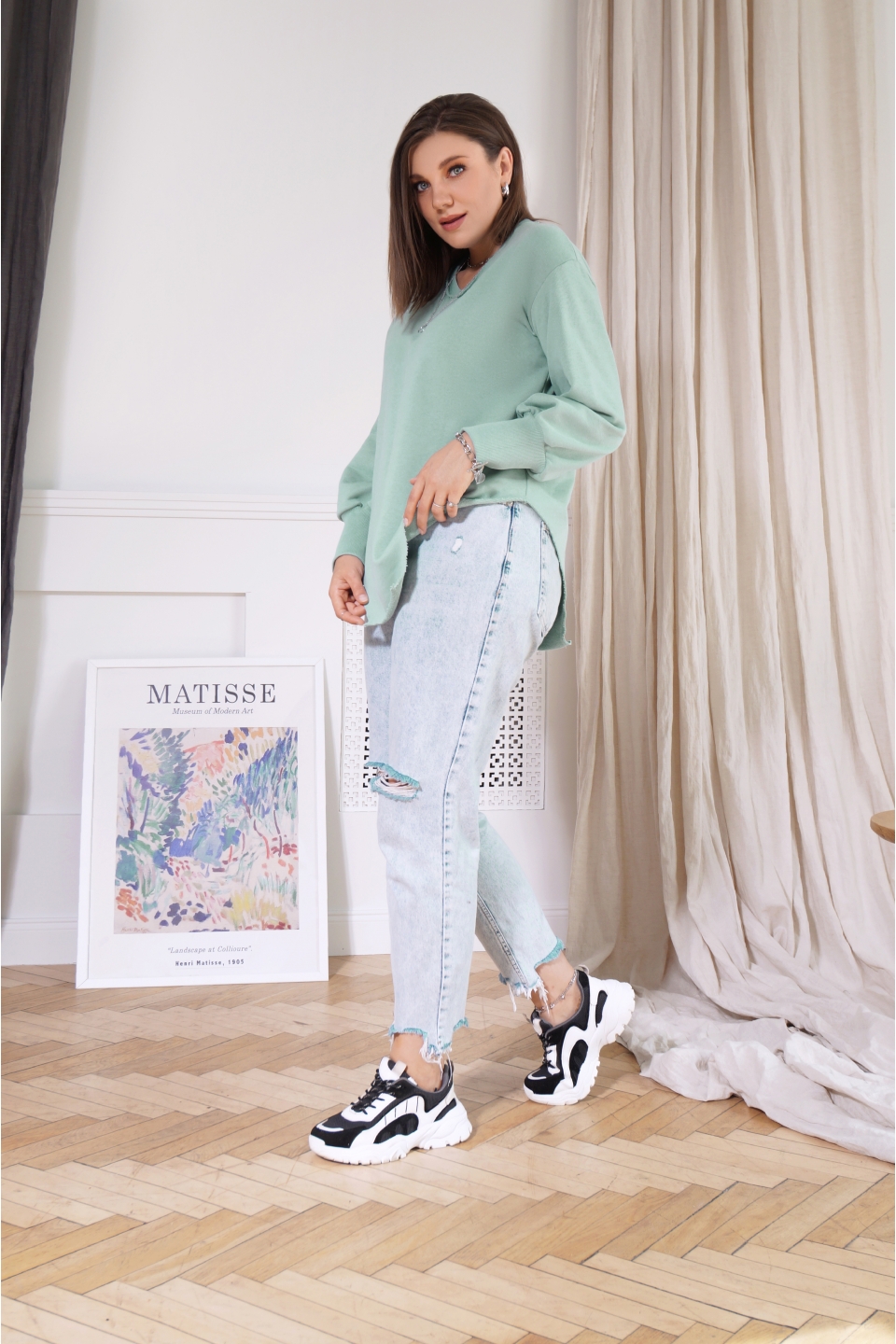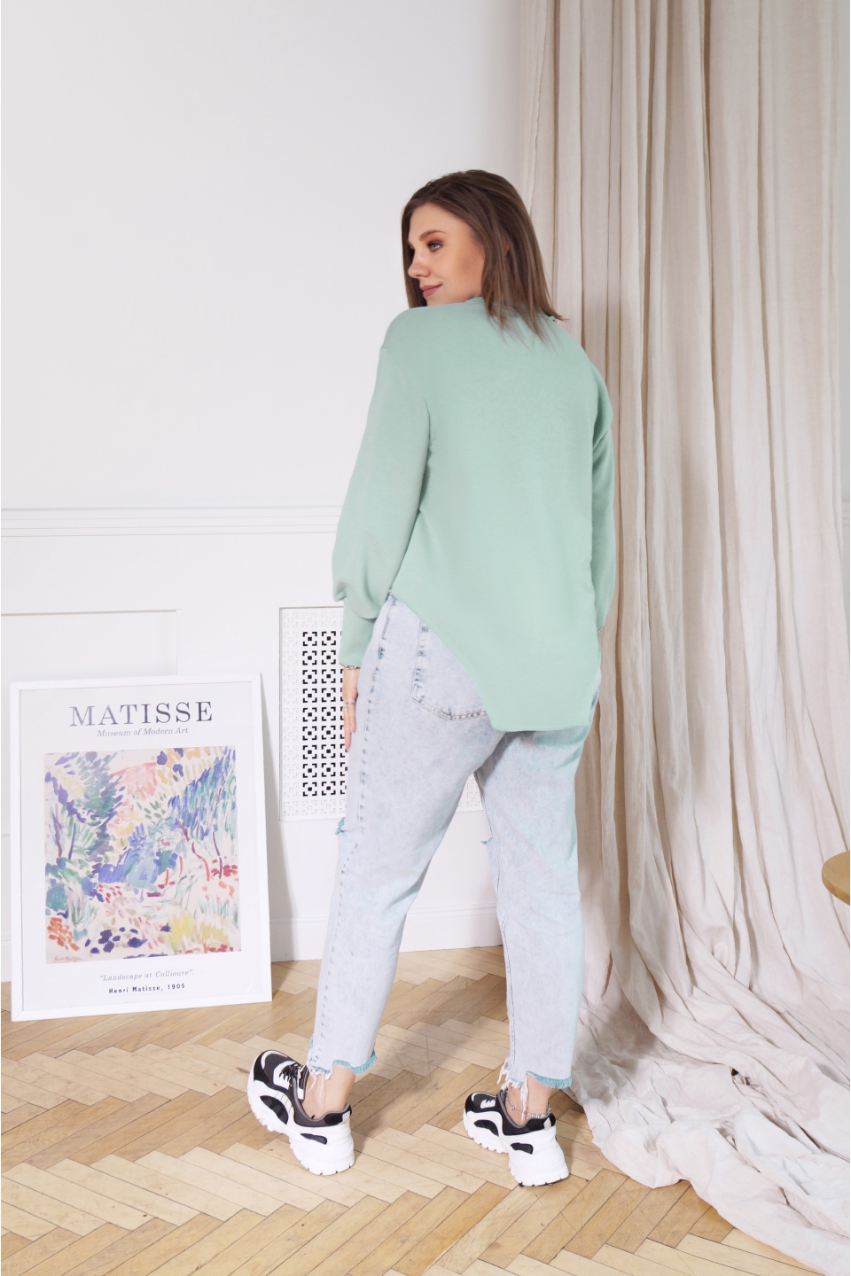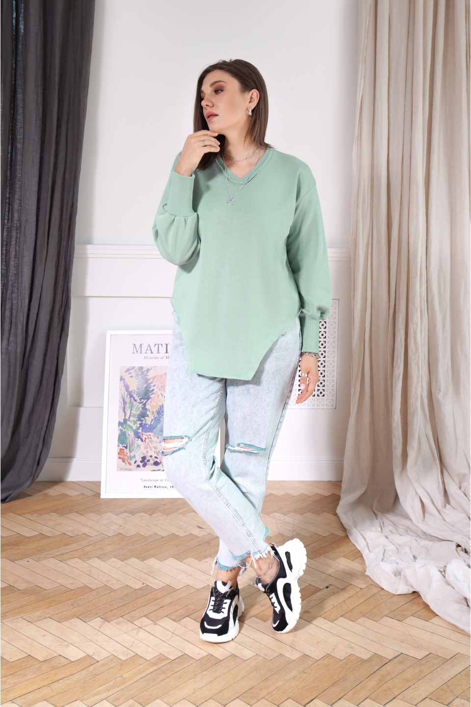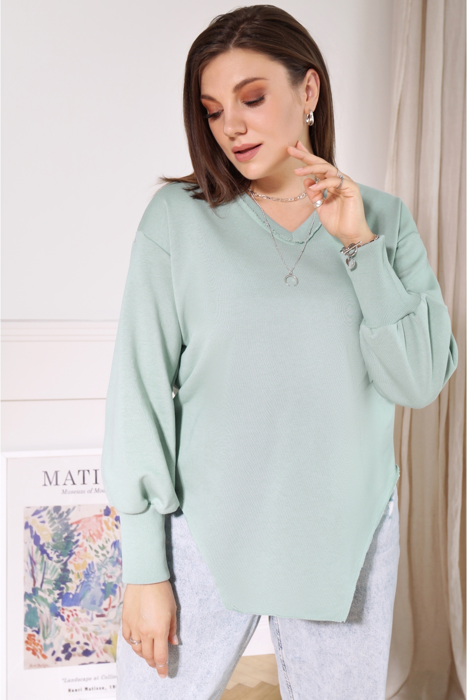 Свитшот свободного кроя, выполнен из хлопкового трикотажа. Модель, притягивающая к себе внимание окружающих. После первой же примерки, вы не захотите с ним расставаться. Рукав втачной со слегка спущенной проймой и расклешённый к низу, обработан широкой манжетой из кашкорсе, что придаёт низу рукава форму «фонарика». Низ изделия обработан декоративной плоскошовной строчкой и имеет необычную форму кроя, напоминающую боди. Это позволяет визуально удлинить ноги и придаёт особую индивидуальность вашему образу.