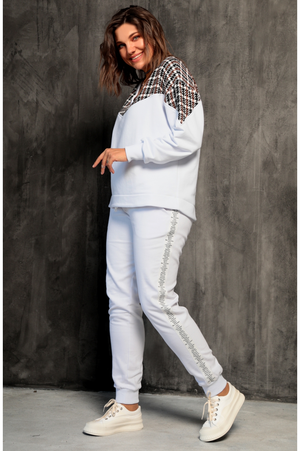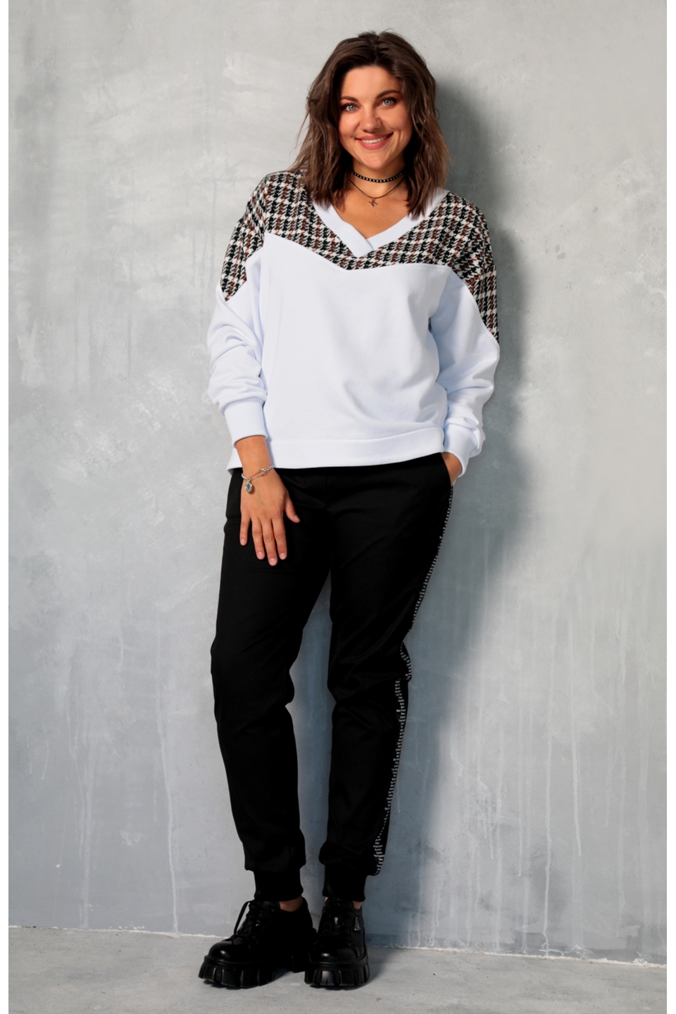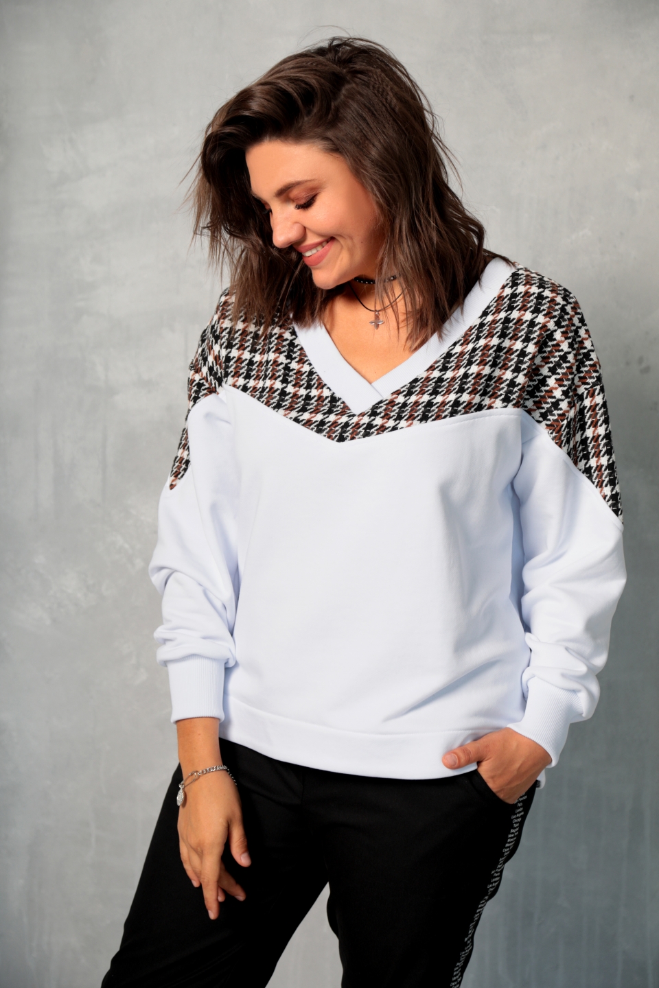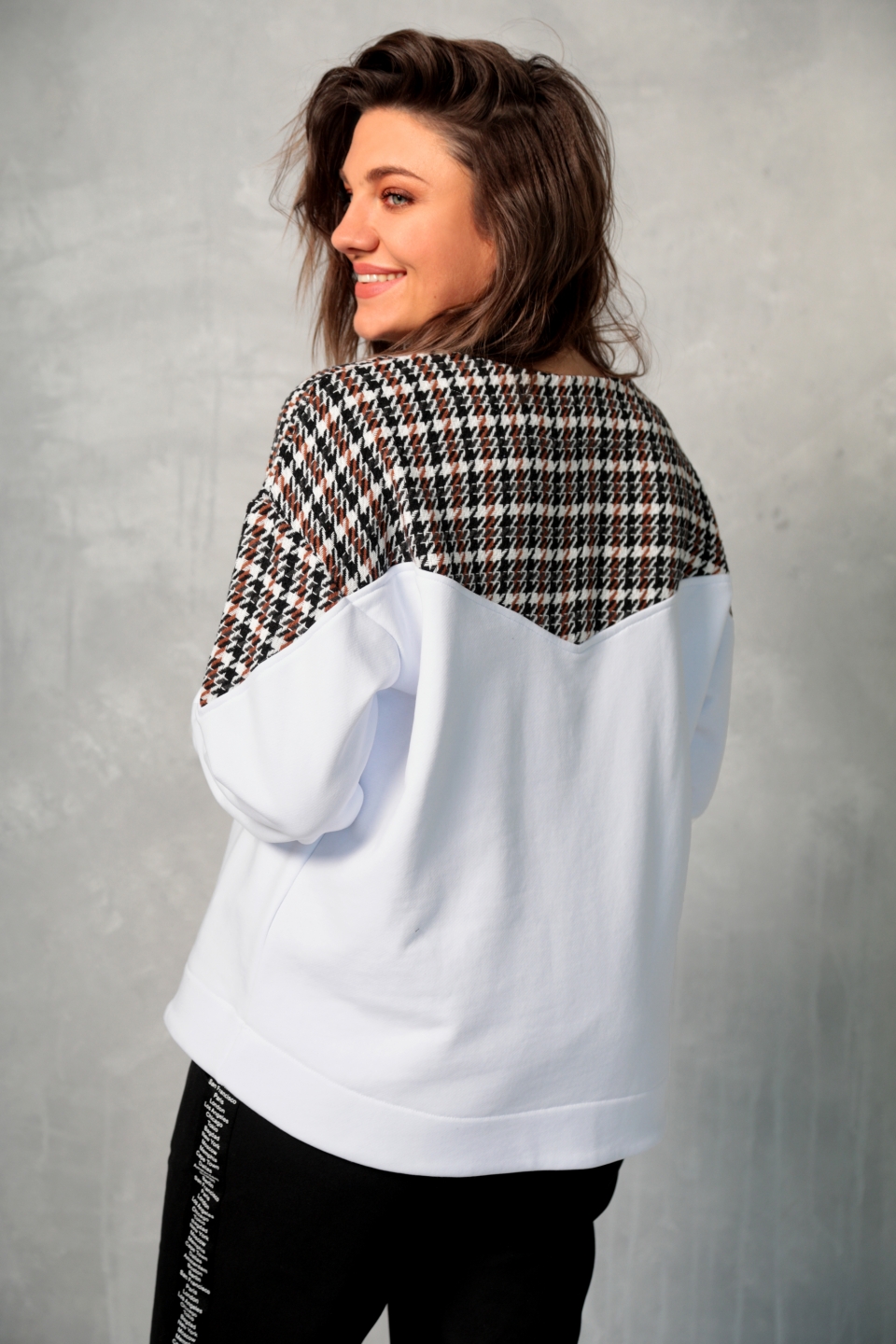 Свитшот свободного кроя, выполнен из хлопкового трикотажа + костюмная ткань. Модель, притягивающая к себе внимание. После первой же примерки, вы не захотите с ним расставаться. Разрезные детали из контрастной расцветки выгодно создают нужные линии и создадут акцент в нужных местах. Рукав втачной со слегка спущенной проймой, низ обработан широкой манжетой из кашкорсе, что придаёт рукаву форму «фонарика». Верх свитшота выполнен из костюмной ткани с принтом "гусиная лапка", нижняя часть из трикотажной трёхнитки. V-образный вырез горловины удлинит шею и визуально вытянет силуэт.
