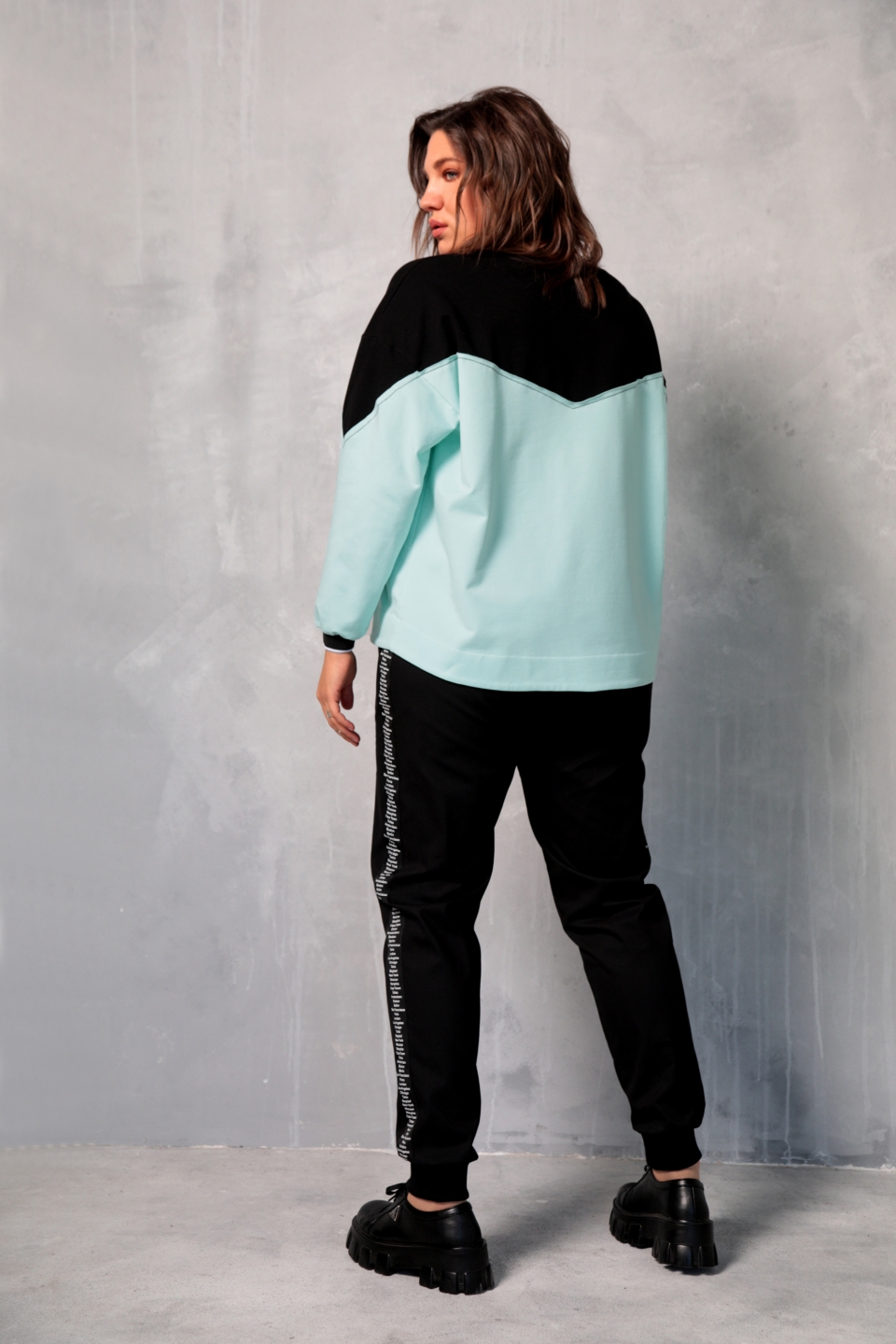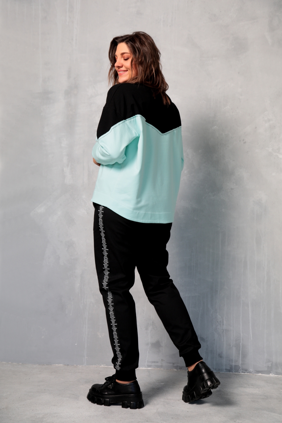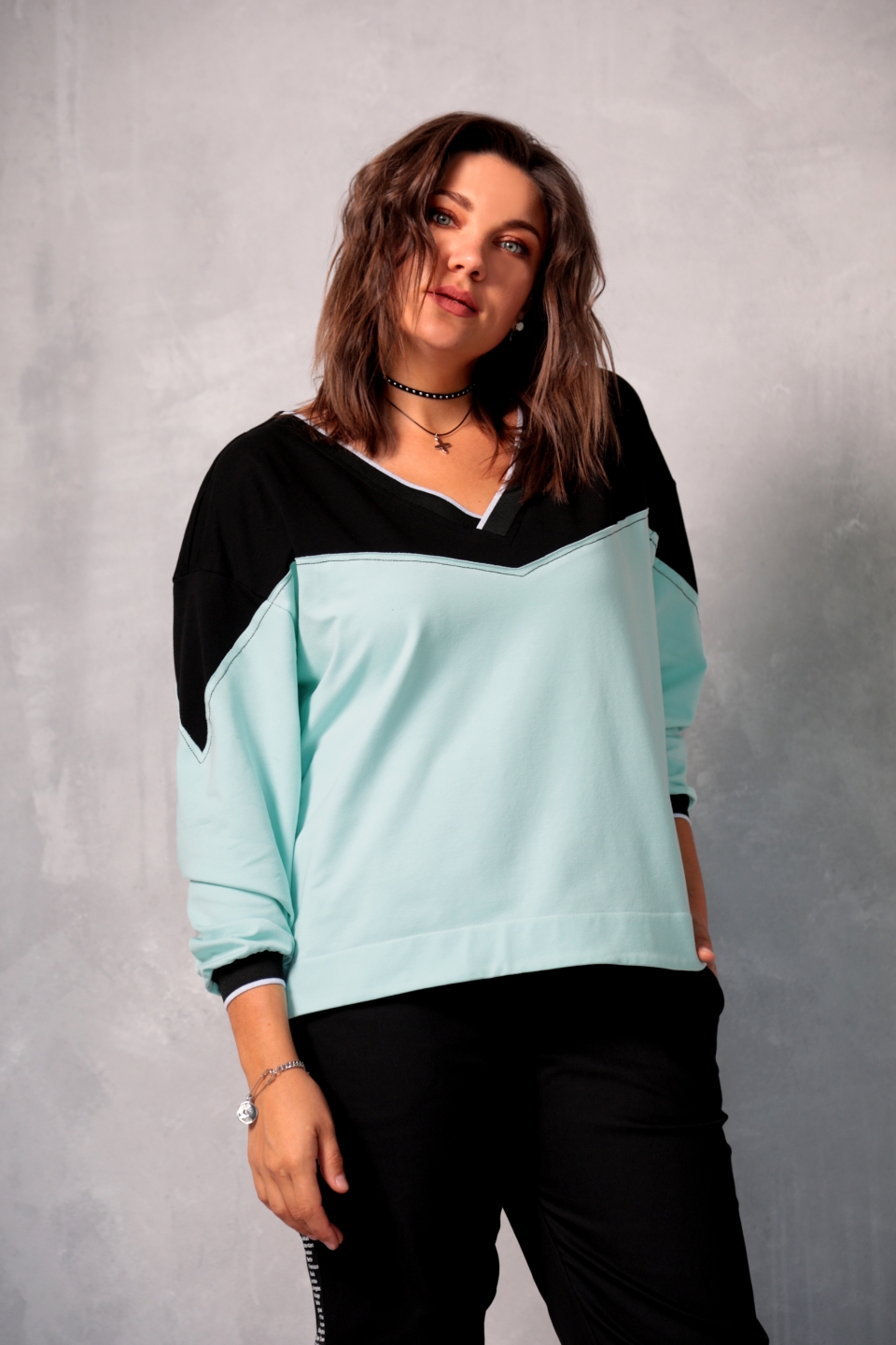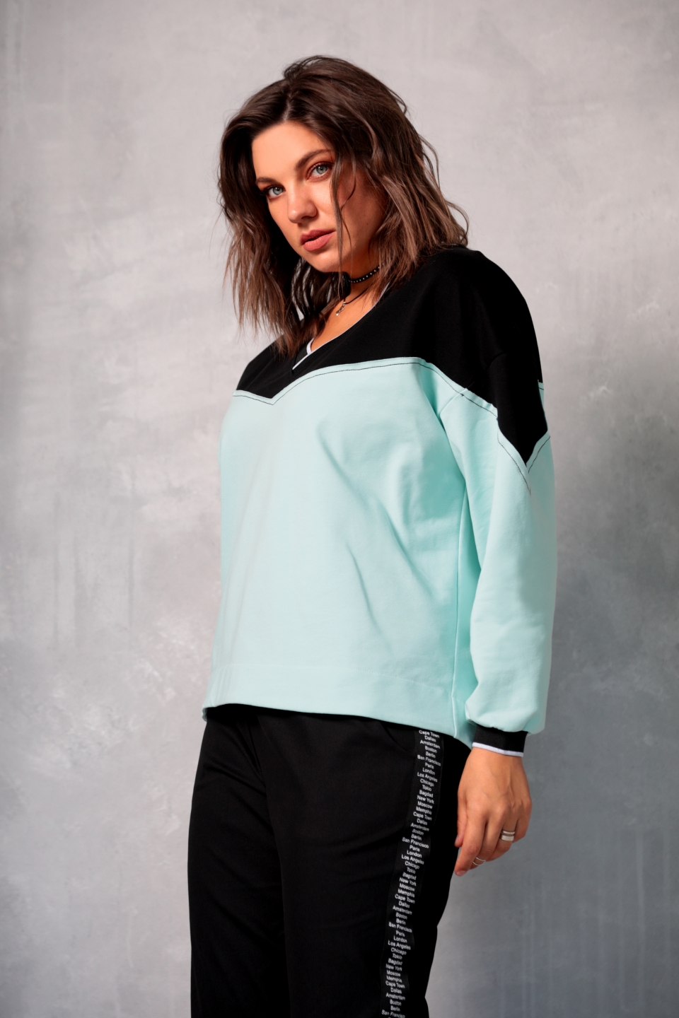 Свитшот свободного кроя, выполнен из трикотажной хлопковой ткани. Рукав втачной со спущенной проймой, низ рукава обработан довязом с нитью из люверса, как на манжете, так и на горловине. V - образный вырез визуально удлиняет шею. Разрезные детали из контрастной расцветки выгодно создают нужные линии и зрительно вытягивают силуэт.