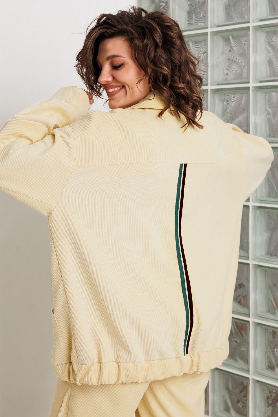 Бомбер выполнен в стиле Оверсайз, слегка