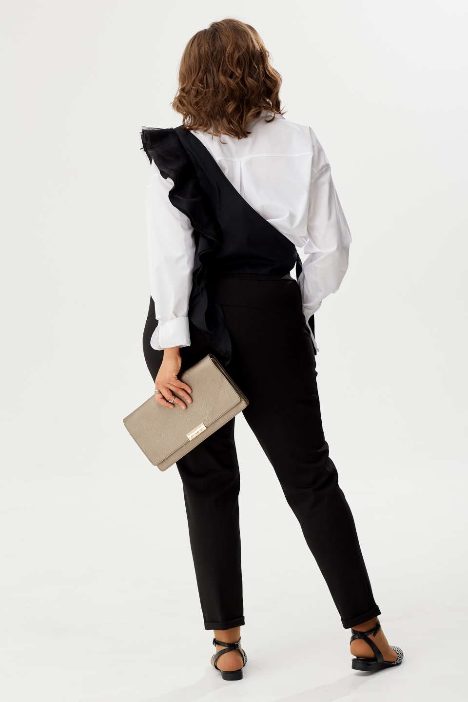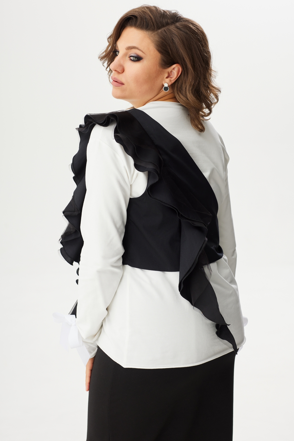 ассиметричного кроя с акцентными воланами. Выполнен из текстильной хлопковой